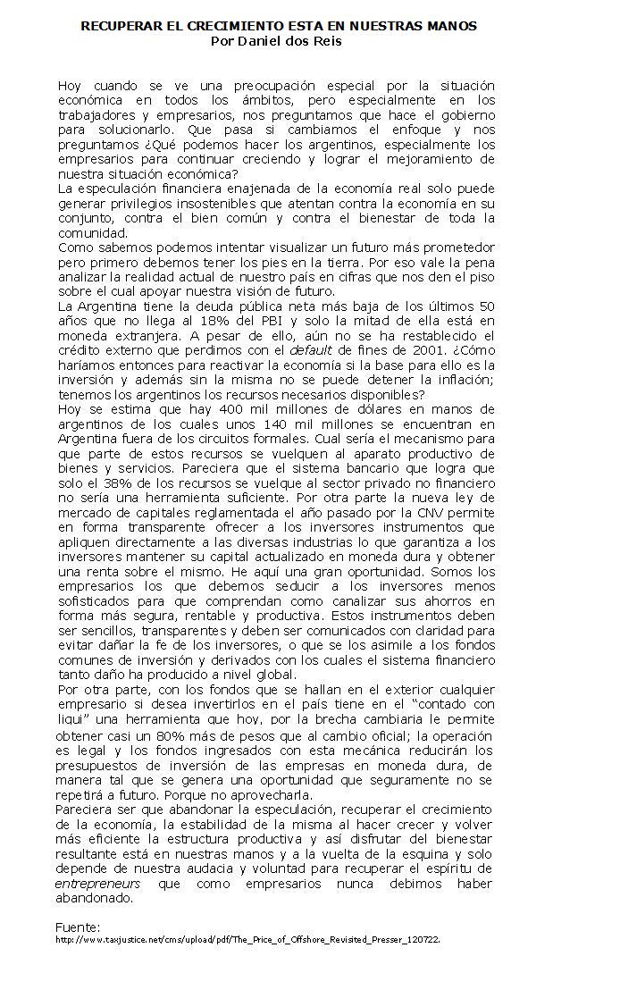 Posteriormente, el 28 de noviembre de 2014, este artículo fue gentilmente publicado por INFOBAE, bajo el título RECUPERAR EL CRECIMIENTO ESTA EN NUESTRAS MANOS, lo que se agradece profundamente.